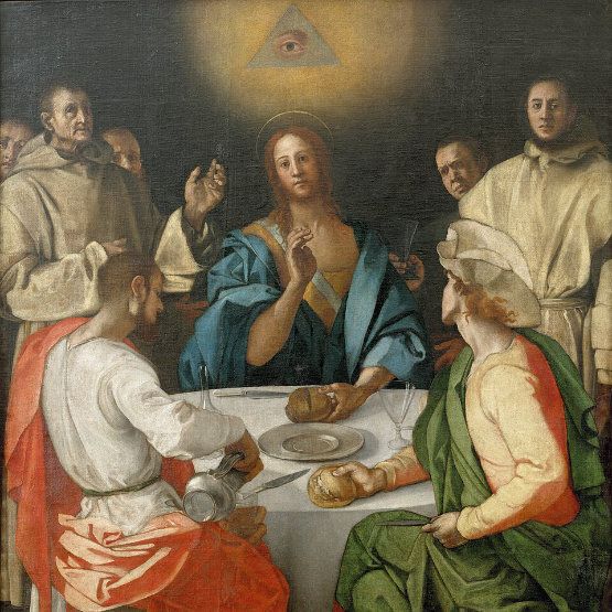 The Eye in its Sacred Context: Detail of Supper at Emmaus by Jacopo Pontormo (1525). Note even here a revisionist conspiracy: the Eye of Providence was added later to cover a 'forbidden' three-faced representation of the Trinity—a literal layer of shifting theological 'laws'. Trinity that is unity sounds eerily familiar. Take home msg: stay in the light of a higher point of view.